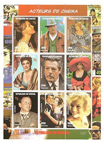 Bloc de timbre de 9 acteurs de cinéma: Romy Schneider, Yves Montand, Catherine Deneuve, Gina Lollobridga, Marcello Mastroianni, Sophia Loren, Frank Sinatra, Dean Martin et Marilyn Monroe. Ces timbres sont gommés et en parfait état. Ils n'ont jamais été montés ou à charnières. Nous emballons tous nos timbres de collection avec une carte de support et enveloppe de violoncelle dans une enveloppe dure soutenu afin qu'ils vous atteignent en parfait état. Nos timbres sont parfaits pour la philatélie et sont aussi excellents comme un souvenir ou un cadeau. La plupart des timbres sont des questions officielles.